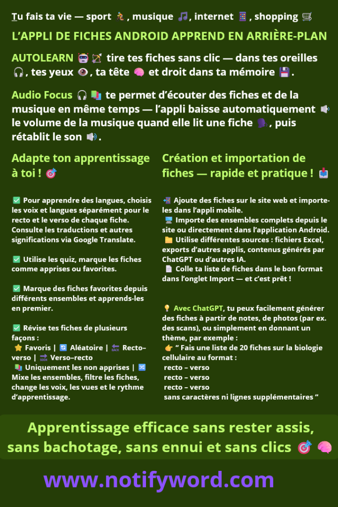 💡 AutoLearn – un système d’apprentissage qui lit, montre et répète tes fiches exactement comme tu le préfères : voix choisies, langues, vitesse, ordre, pauses, mode de mémorisation inversée.