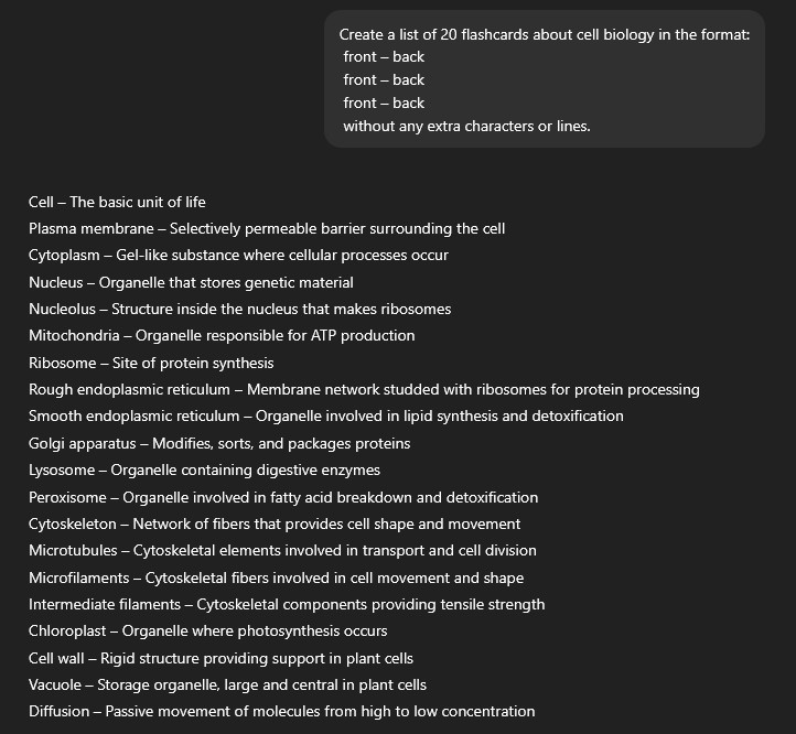 - Podaj polecenie do generowania fiszek, przykładowe polecenie w ChatGPT lub innej sztucznej inteligencji- „Zrób listę 20 fiszek o biologii komórki w formacie: przód – tył, bez dodatkowych znaków ani linii, Jedna linia to jedna fiszka” *czasem AI nie rozumie formatu i można podać format : przód „–” tył.